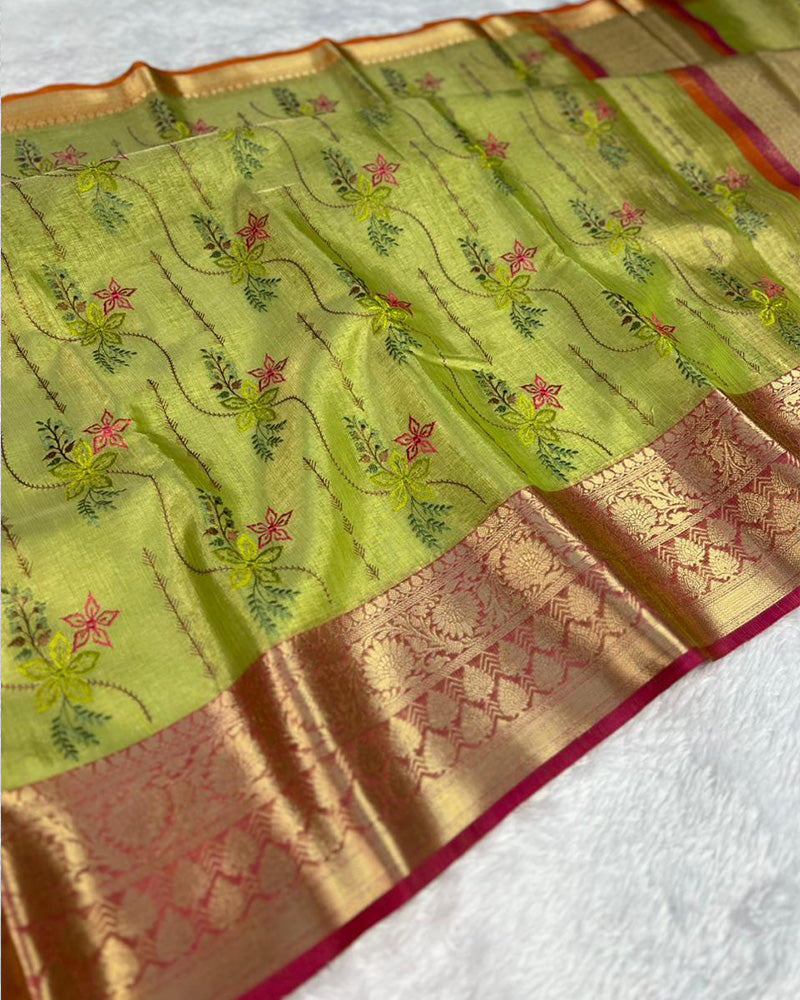 Embrace traditional elegance with this mehndi color tissue silk saree, adorned with delicate floral embroidery for a refined look. Lightweight and sophisticated, it comes with an unstitched blouse, making it ideal for festive occasions and special celebrations.