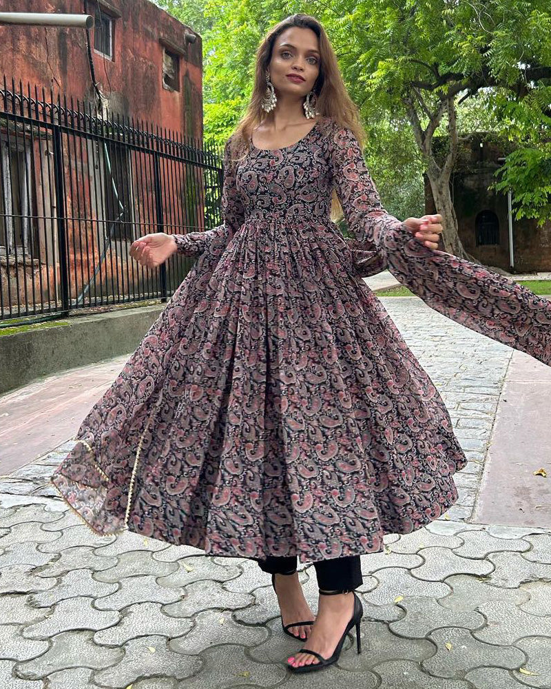 The Mango Kalamkari Printed Full Stitched Three Piece Anarkali Suit is a beautifully designed ethnic outfit that exudes grace and elegance. This three-piece ensemble includes a full-length Anarkali dress, bottoms (salwar or churidar), and a matching dupatta.