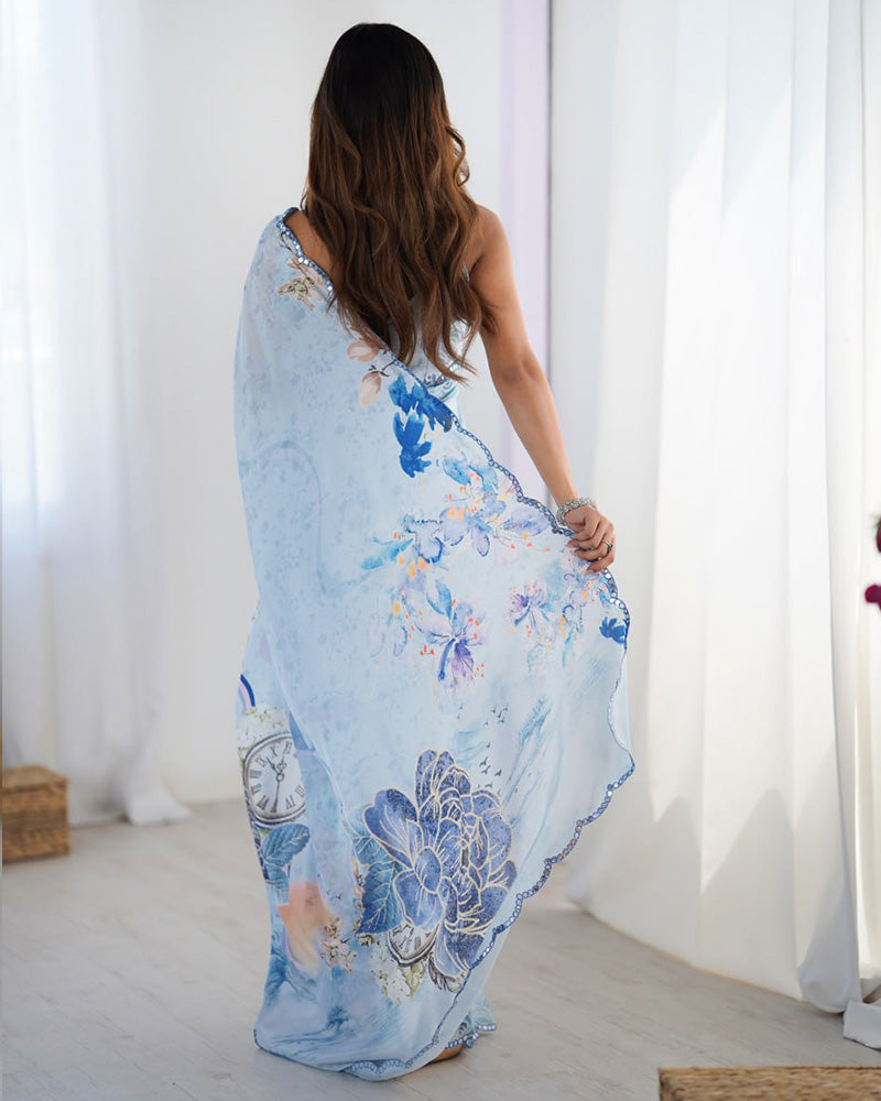 Step into serene sophistication with this ocean color Chinnon silk saree, adorned with exquisite mirror work for a touch of shimmer. Paired with an unstitched blouse, it’s perfect for festive occasions, weddings, and traditional celebrations.