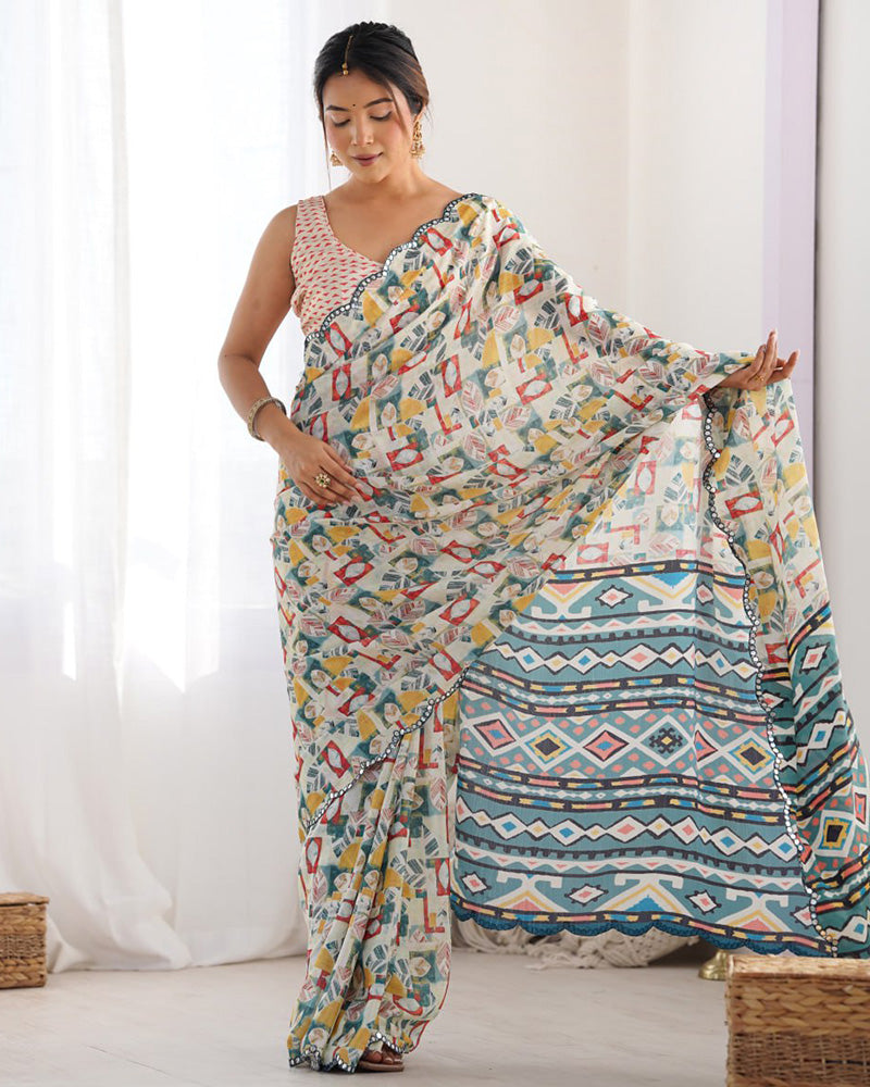 Work : Print Work With Beautiful Kutchi Work Mirror Lace Border