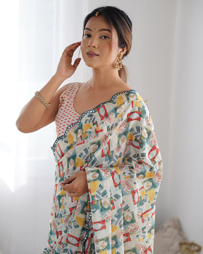 Embrace timeless elegance with this off-white Chinnon silk saree, featuring a smooth texture and graceful drape. Paired with an unstitched blouse, it’s perfect for festive occasions, weddings, and traditional celebrations.