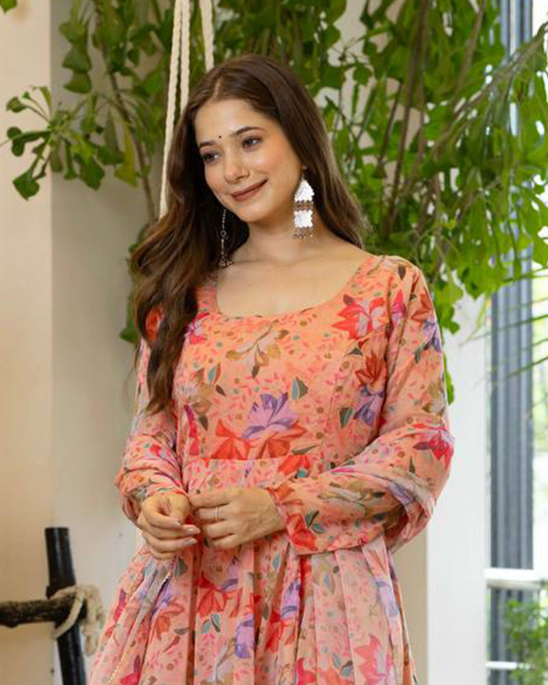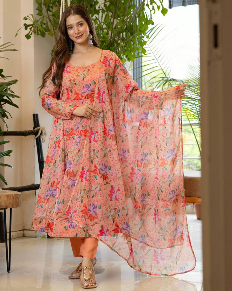 Peach Color Digital Printed Organza Anarkali Suit