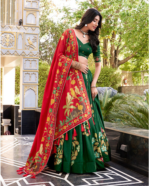 Add a touch of regal charm with this Peacock Blue Tussar Silk Printed Lehenga Choli with Foil Work and Unstitched Blouse. Featuring rich prints and shimmering foil accents on luxurious tussar silk, it's perfect for festive occasions, weddings, and grand celebrations.