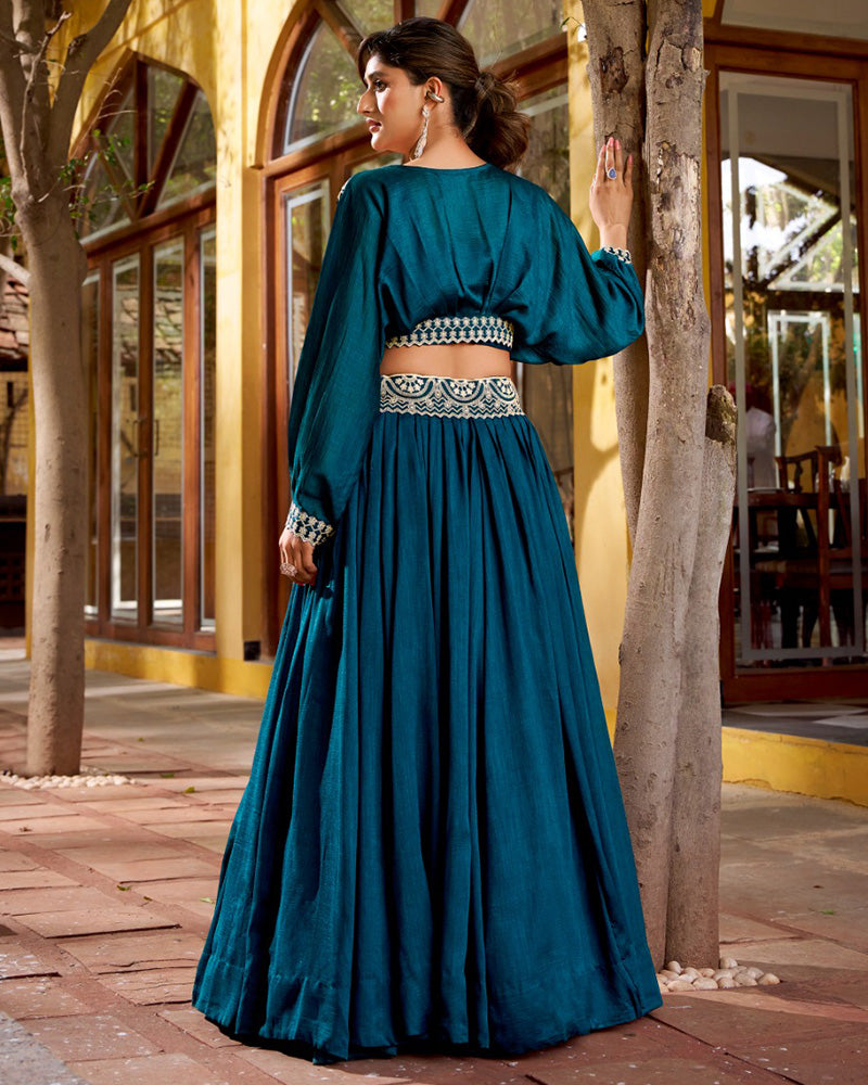 Peacock blue color vichitra silk embroidered lehenga choli featuring intricate embroidery and a rich, elegant finish that enhances its graceful appeal. Perfect for weddings, festive occasions, and traditional celebrations.