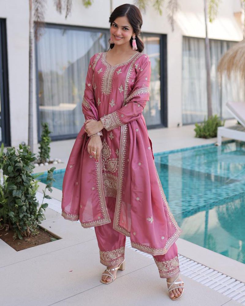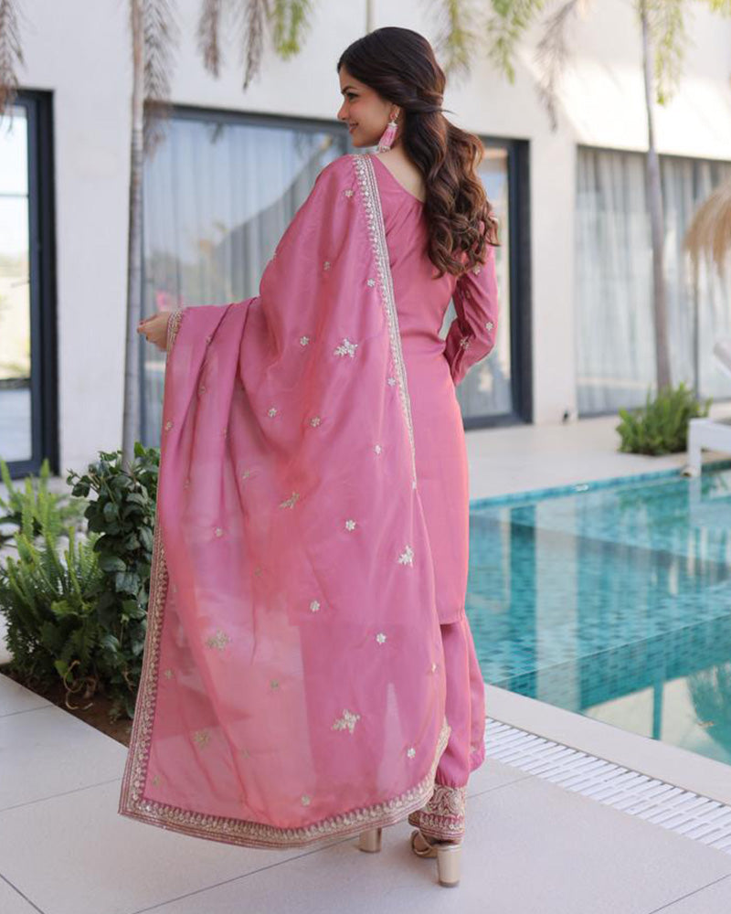 Charming pink kurti suit crafted in soft Ho silk, adorned with elegant embroidery. Designed for comfort and style, this outfit offers a refined festive look—perfect for celebrations and special occasions.