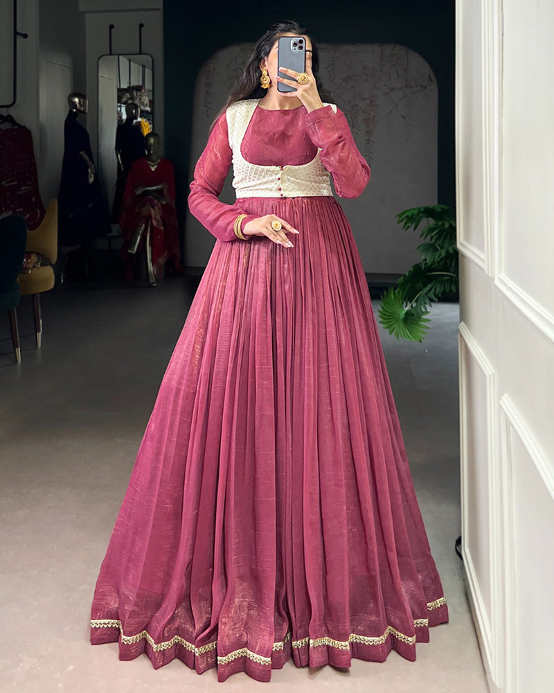 Exude glamour with this pink color silver glossy gown, featuring a lustrous finish and elegant design. Perfect for festive occasions, parties, and special celebrations, it blends sophistication with contemporary style