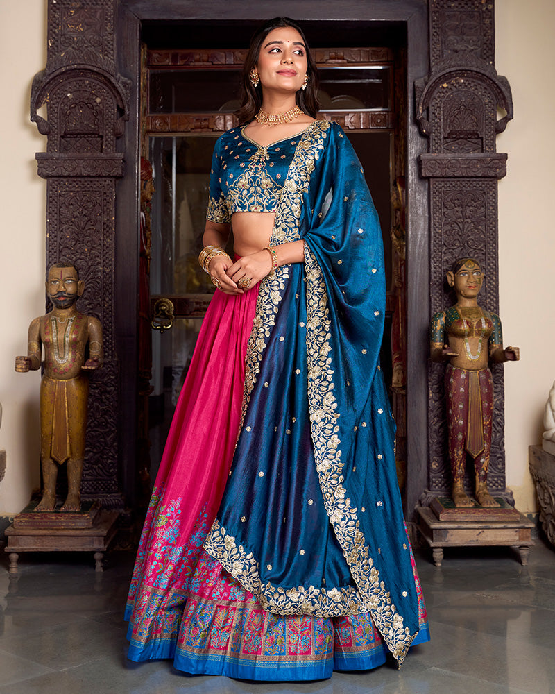 Grace meets elegance in this pink Tussar silk lehenga choli, featuring beautiful prints and delicate foil work. Paired with an unstitched blouse for customizable styling, it's a perfect choice for festive occasions, weddings, and traditional gatherings.