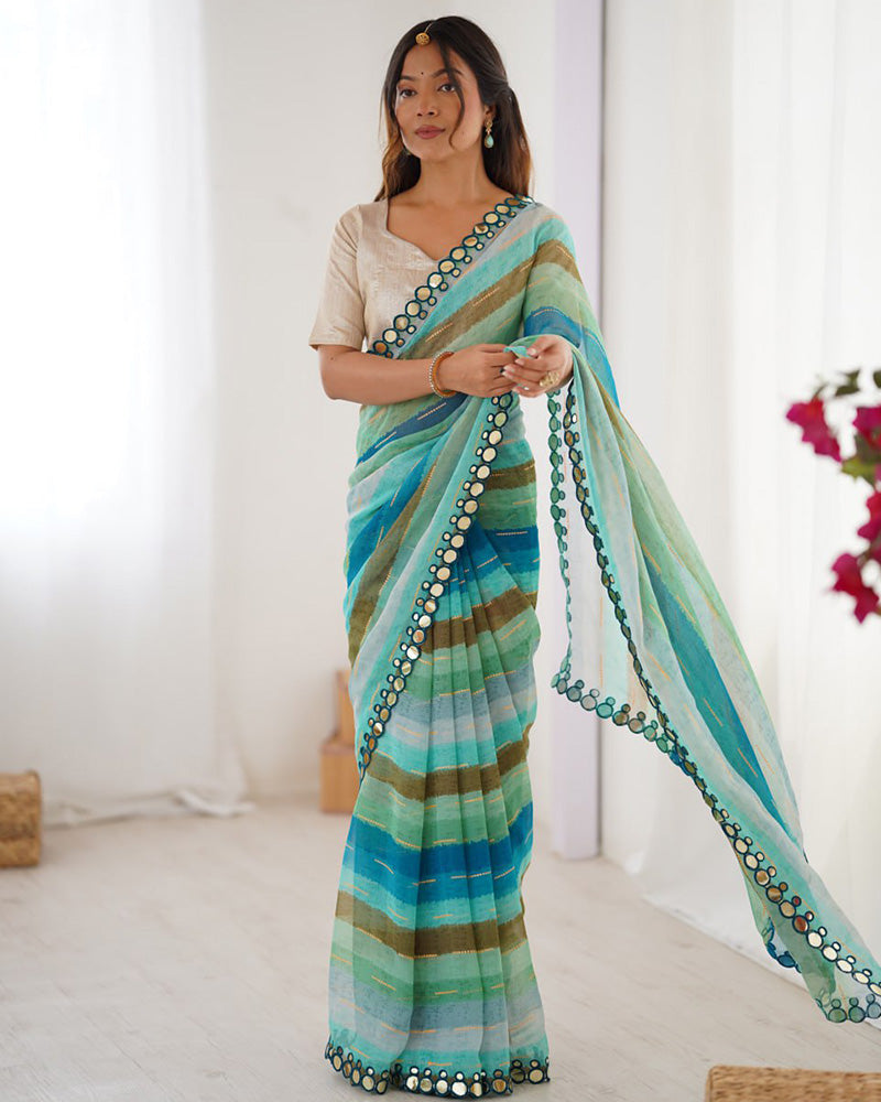 Work : Laheriya Print With Zari Work On Print With Double Line Paper Mirror Outing Border