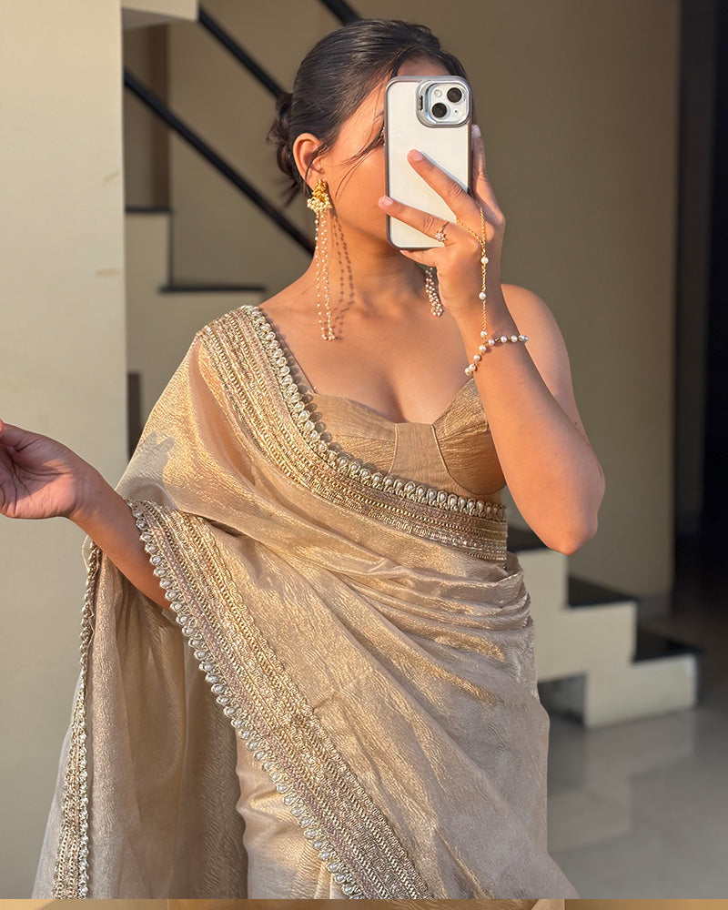 Radiate subtle elegance with this premium cream tissue crush saree, beautifully textured with a rich crushed finish for a luxurious appeal. Lightweight and graceful, it drapes effortlessly for any festive or special occasion. The soft, neutral cream tone adds a touch of timeless sophistication. Comes with an unstitch blouse for a perfect customized fit.