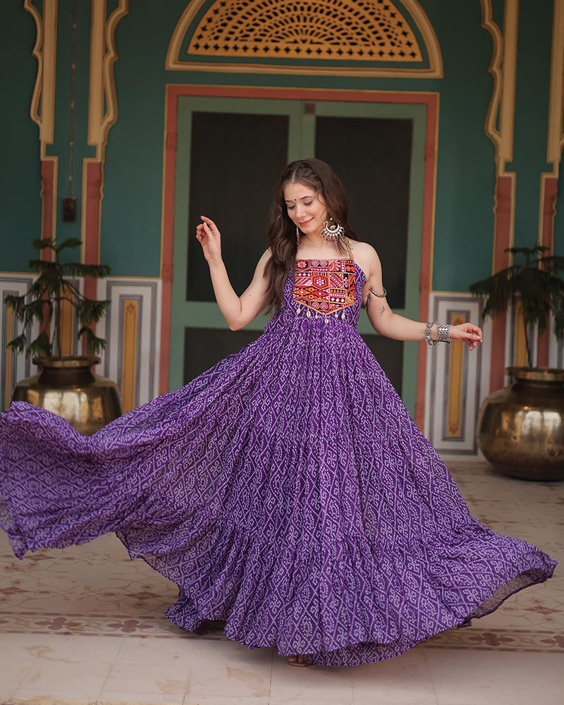 The Purple Color Georgette Bandhej Print Navratri Gown is an exquisite choice for festive celebrations. Made from lightweight and elegant georgette fabric, this gown features a deep purple hue with traditional Bandhej print, exuding ethnic charm and sophistication. The flowing silhouette and detailed craftsmanship ensure both comfort and style, making it perfect for dancing and enjoying Navratri festivities. This gown combines cultural heritage with modern design, ensuring you make a graceful and memorable impression.