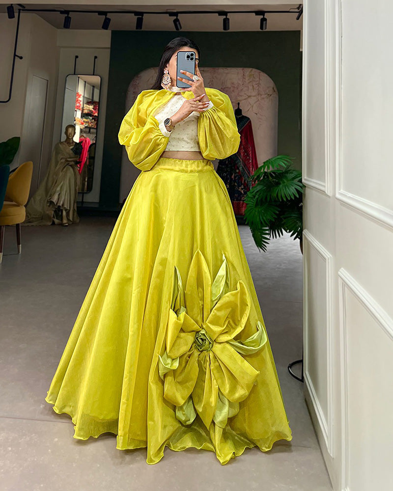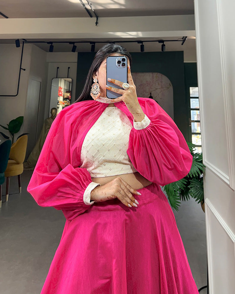 Elevate your ethnic style with this Rajwadi Chanderi Silk Two-Color Fully Stitched Crop Top Lehenga Choli. The exquisite chanderi silk fabric is adorned with a captivating combination of two colors, creating a regal and harmonious ensemble. Meticulously crafted, the fully stitched crop top adds a contemporary touch, complemented by the flowing lehenga and choli. Ideal for special occasions, weddings, or cultural celebrations, this Rajwadi Chanderi Silk Lehenga Choli promises a refined and captivating presence. Step into the spotlight with this ensemble that seamlessly blends traditional elegance with modern sophistication.