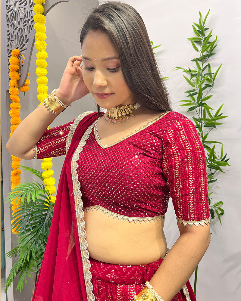 This Rani Pink Color Designer Georgette Embroidered Lehenga Choli is a radiant fusion of tradition and contemporary design. Crafted from luxurious georgette fabric, the lehenga features intricate embroidery, adding elegance to the ensemble. Paired with a complementing choli, this outfit radiates grace and charm. Ideal for special occasions or weddings, this lehenga choli ensemble is a timeless addition to any wardrobe, showcasing refined style and sophistication.