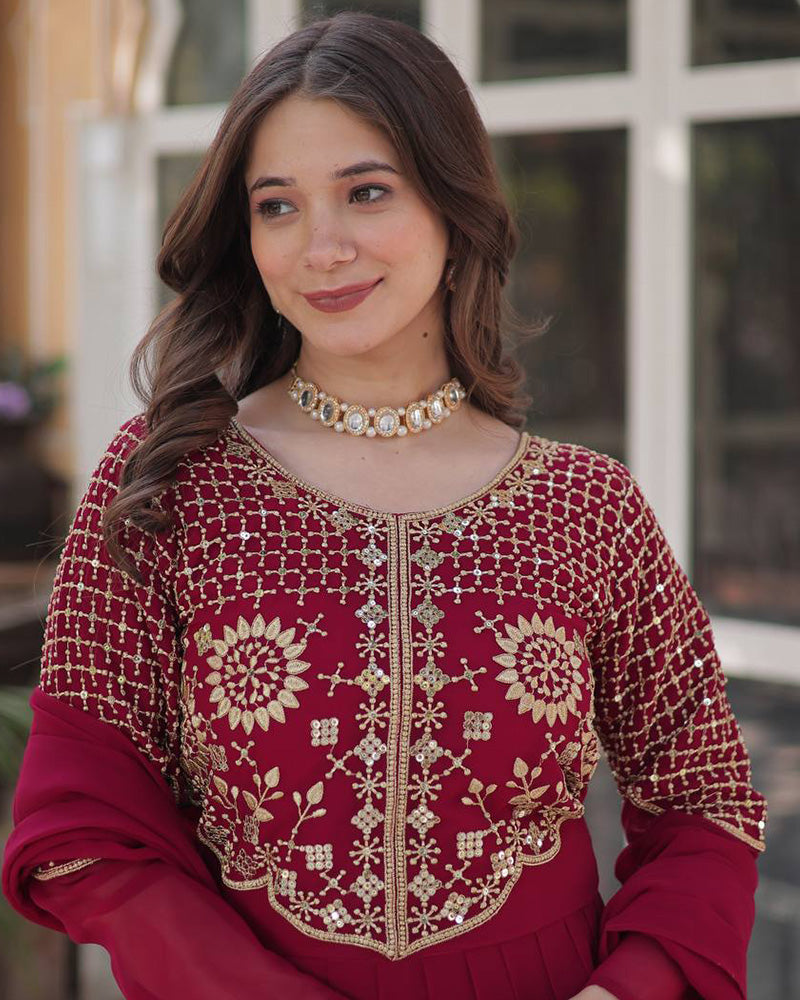 Elevate your wardrobe with this exquisite rani pink gown crafted from faux blooming georgette, offering both elegance and comfort. The gown features intricate sequins and zari embroidery work, a flattering V-neckline, and full sleeves, exuding sophistication. Accompanied by a matching dupatta adorned with rich sequins and embroidered lace border, this ensemble is perfect for festive occasions and celebrations, seamlessly blending traditional charm with contemporary style.