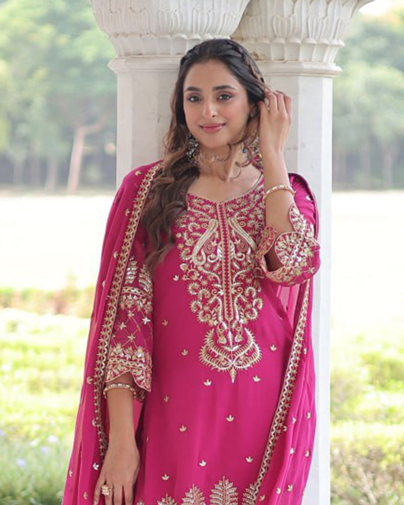 Rani Pink Color Georgette Embroidered Three Piece Kurti Suit