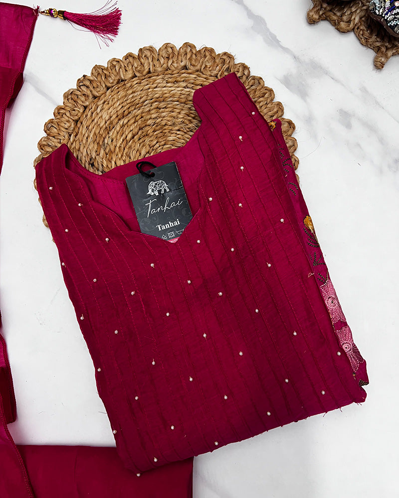 Make a bold festive statement with this Rani Pink Color Roman Chanderi Silk Embroidered Plazzo Suit. Crafted from rich Roman Chanderi silk, it features intricate embroidery that enhances its royal appeal. The vibrant rani pink shade adds elegance and charm, while the stylish plazzo ensures comfort with graceful movement. Perfect for weddings, celebrations, and special occasions.