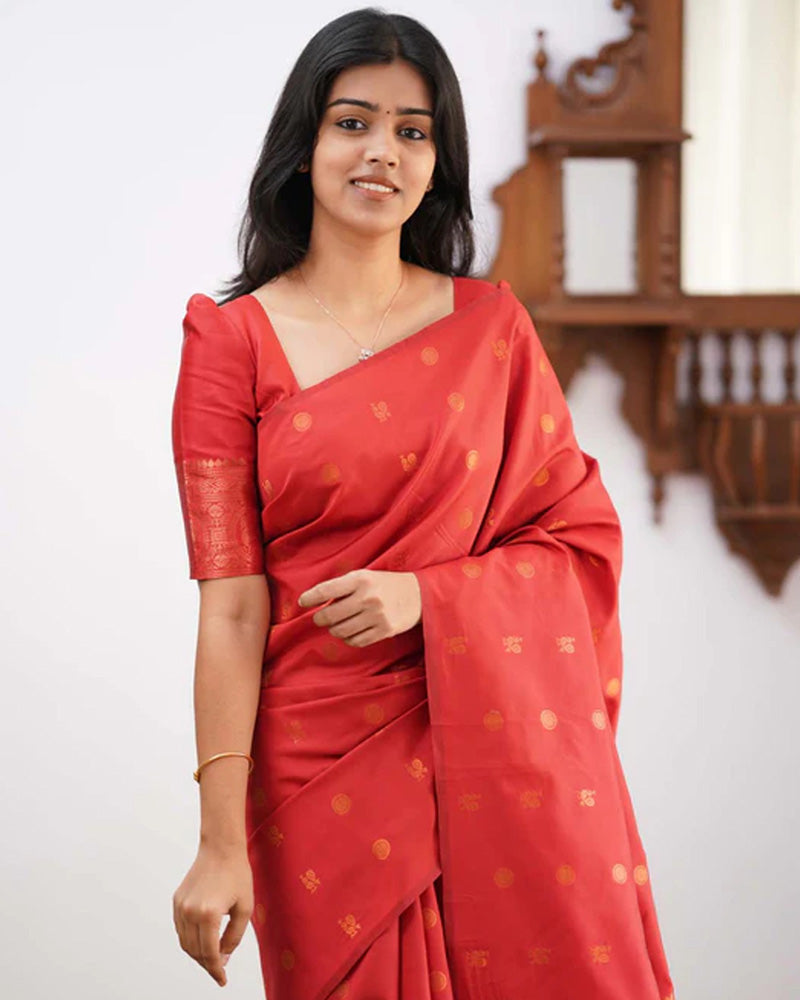 A vibrant red Banarasi jacquard soft silk saree, showcasing intricate weaving and traditional motifs. Perfect for weddings, festive celebrations, and cultural occasions, this saree combines timeless elegance with luxurious charm. Paired with an unstitched blouse piece, it allows for personalized tailoring to achieve a flawless look.