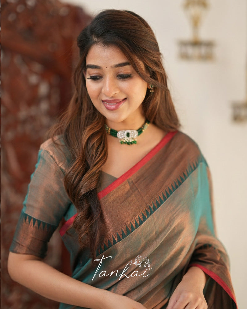 Fresh and graceful, this sea green tissue cotton saree offers a lightweight, airy drape with a soothing, elegant appeal. It comes with an unstitched blouse, allowing you to customize the fit for a perfect blend of comfort and style.