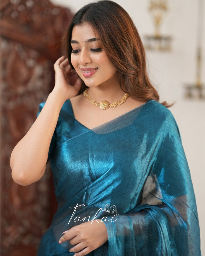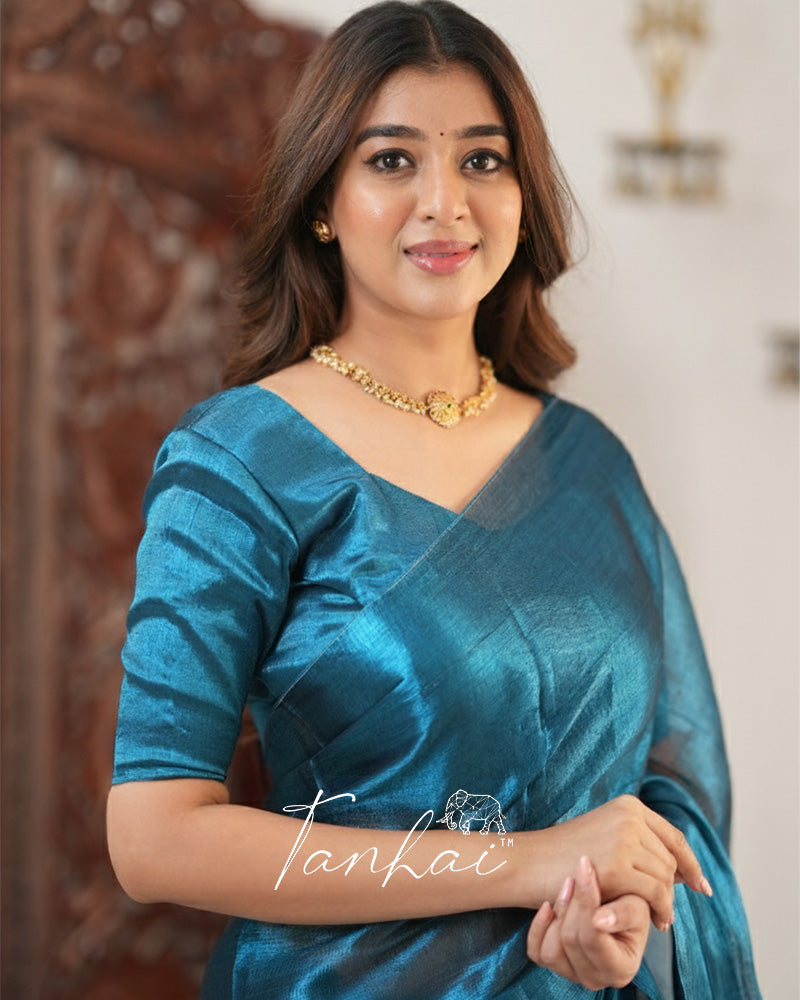Elegant and refreshing, this teal green handloom Raga tissue cotton saree showcases a finely crafted weave with a soft, lightweight drape. Paired with an unstitched blouse, it allows for a customized fit, making it perfect for festive and traditional occasions.