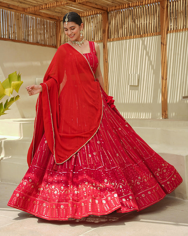 Tomato Red Color Lucknowi Style Embroidered Soft Georgette Lehenga Choli