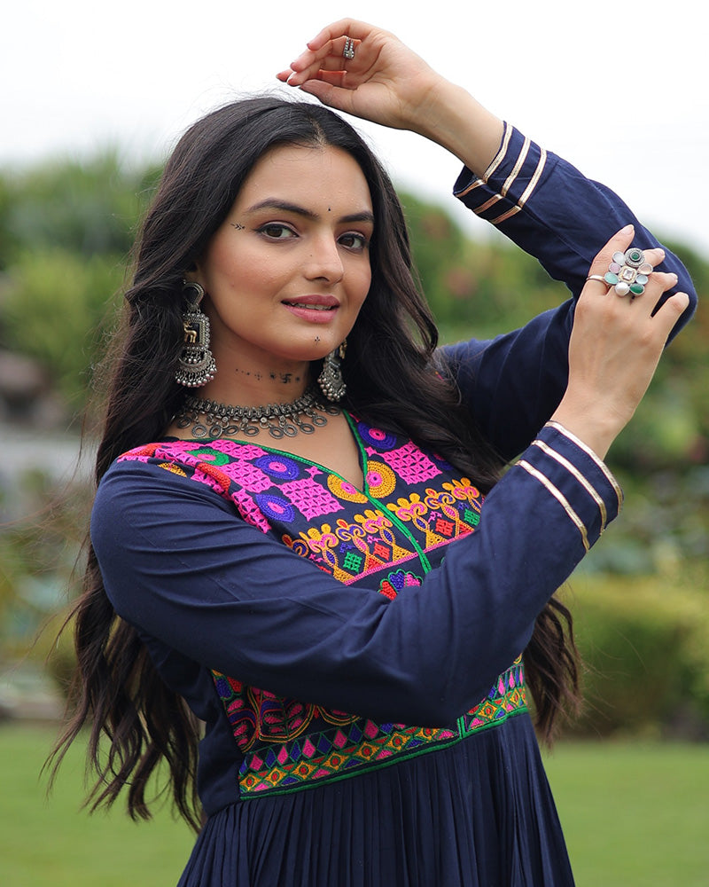 Traditional Navy Blue Kutchi Embroidered Navratri Gown