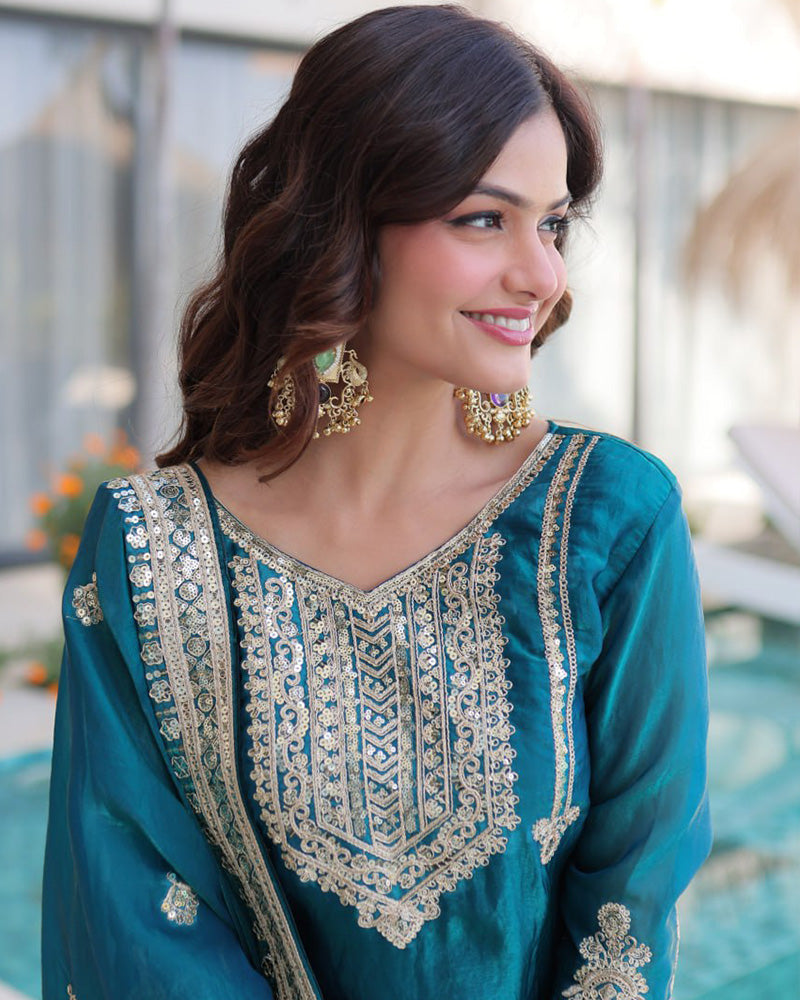 Step into timeless elegance with this Teal Blue Fendi Silk Embroidered Kurti Suit, adorned with intricate embroidery and a rich silk texture. Perfect for festive occasions, celebrations, and special gatherings.