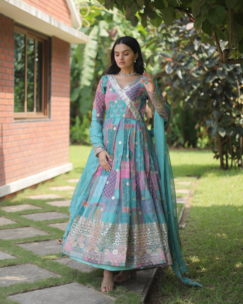 Wedding Wear Embroidery Sky Blue Color Gown With Dupatta