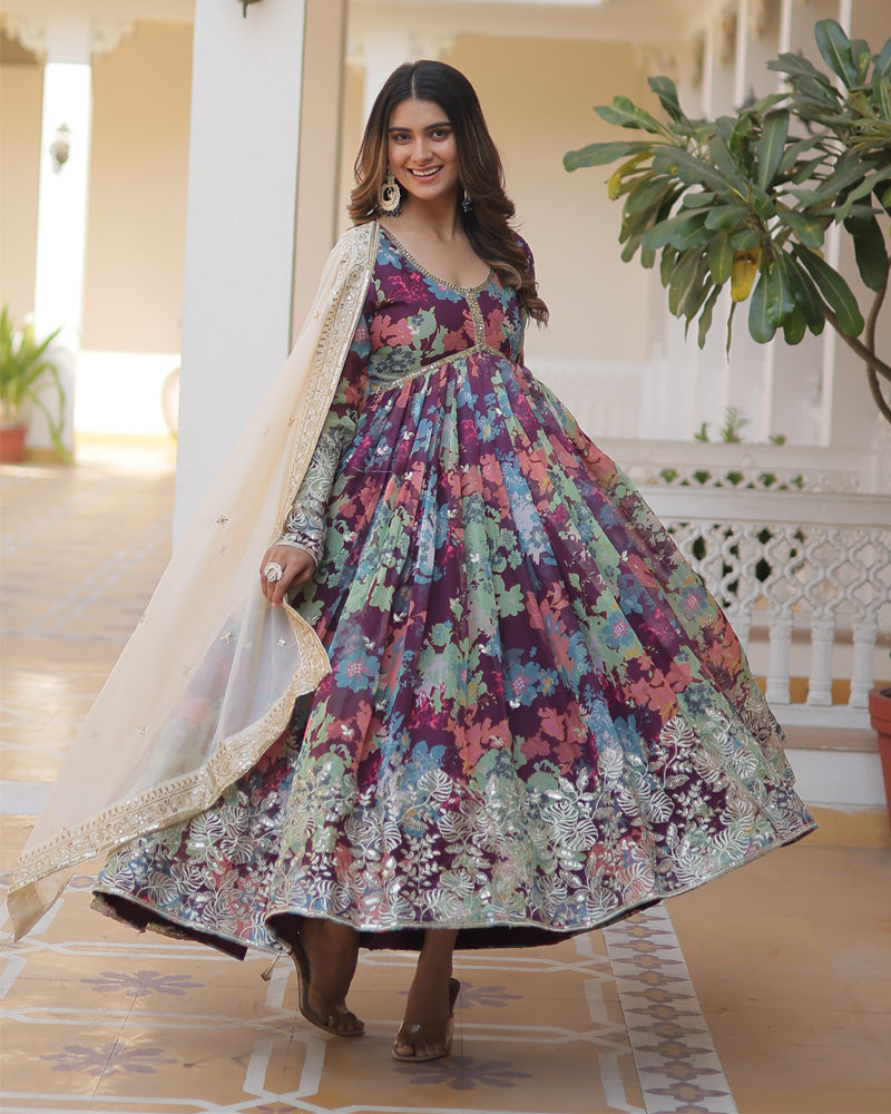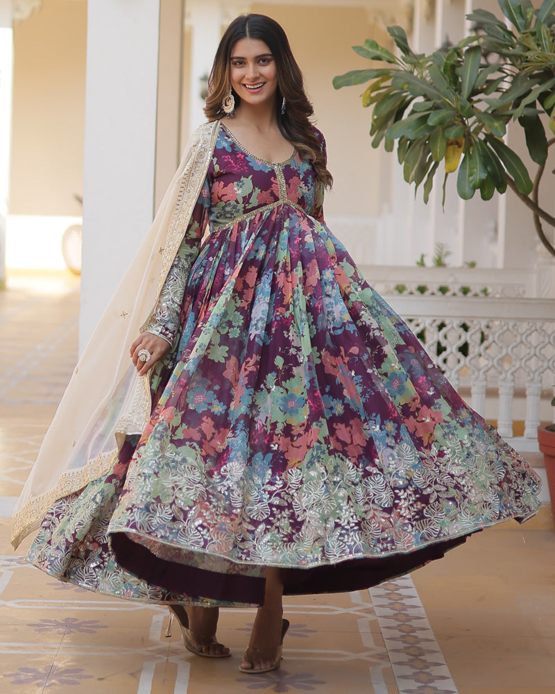 Wedding Wear Floral Embroidered Wine Color Alia Cut Gown With Dupatta