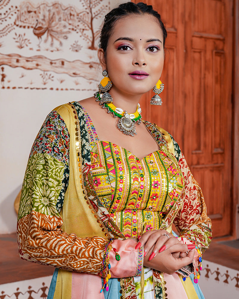 This Western-Style Multi-Color Rayon Cotton Embroidered Lehenga Choli is a vibrant fusion of modernity and tradition. Crafted from breathable rayon cotton, the lehenga boasts colorful embroidery that adds a lively touch to the ensemble. Paired with a matching choli, this outfit exudes contemporary charm with a hint of traditional flair. Perfect for festive occasions or cultural events, this lehenga choli ensemble is a stylish addition to any wardrobe, offering a seamless blend of western and ethnic aesthetics.