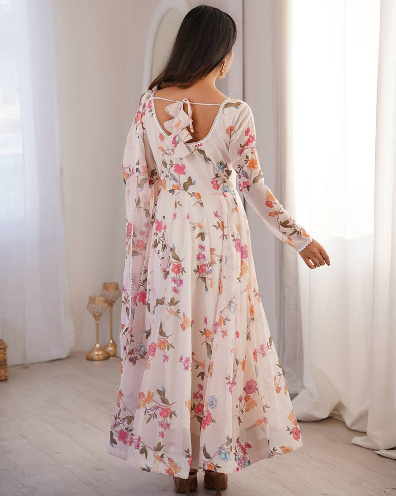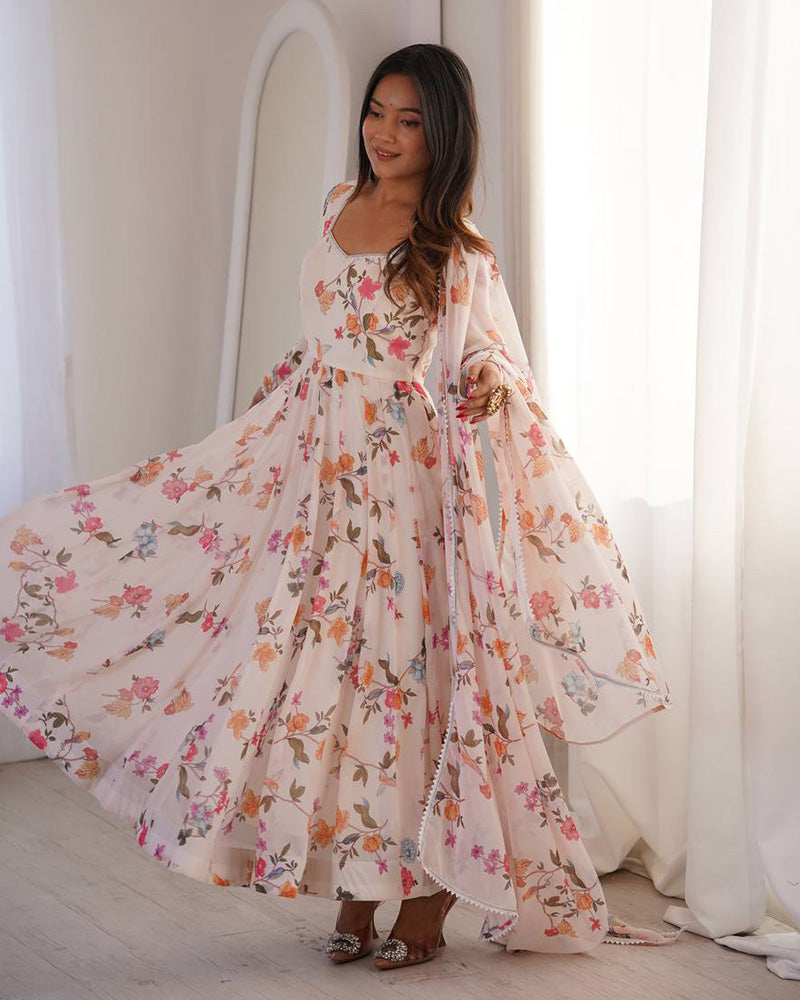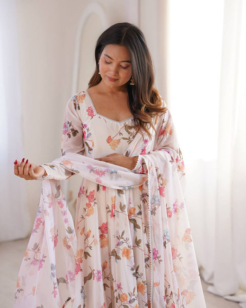 An elegant white georgette three-piece Anarkali suit designed with a flowing silhouette and refined detailing. Crafted from lightweight fabric for effortless grace, this ensemble is perfect for festive occasions, celebrations, and sophisticated daytime events.
