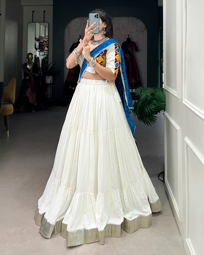 This white-colored Navratri lehenga choli, crafted from soft rayon fabric, showcases a fashionable ruffle style. Perfect for festive celebrations, this ensemble combines modern elegance with traditional flair, ensuring a chic and comfortable look for Navratri.
