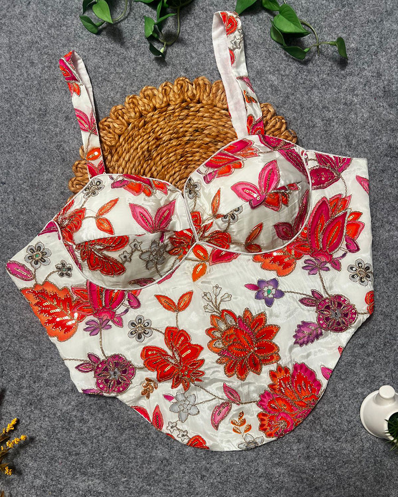 Enhance your look with this White Rumali Silk Embroidered Spaghetti Blouse, featuring delicate embroidery and a sleek, modern design. Perfect to pair with sarees or lehengas for elegant and festive occasions.