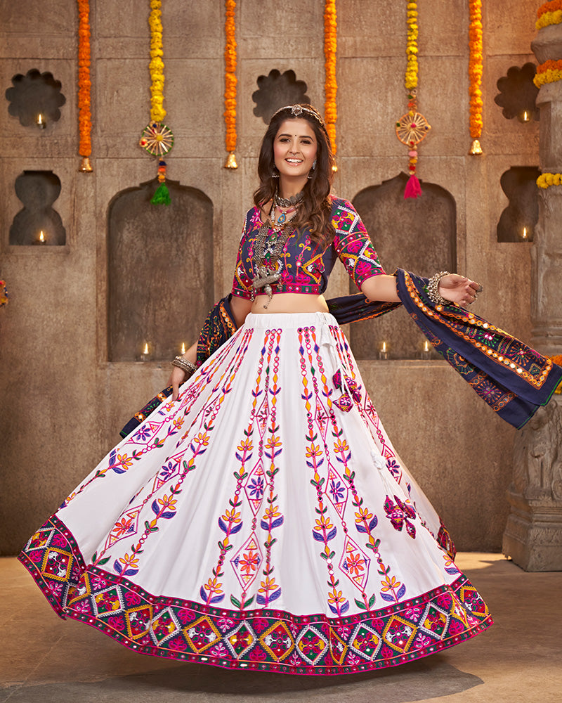 White Color Viscose Rayon Thread With Mirror Work Navratri Lehenga Choli