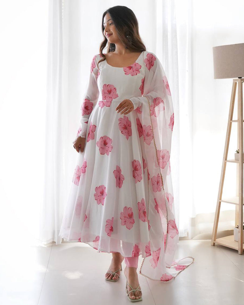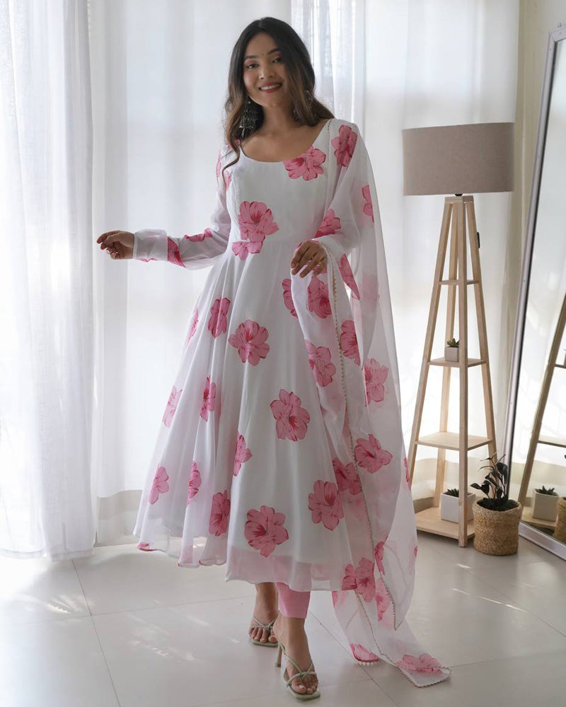 Step into a world of grace and enchantment with this white tebby organza silk anarkali suit. Crafted with precision, it showcases a full-stitched design adorned with beautiful rose prints. The delicate organza fabric lends an ethereal touch, while the full-stitched silhouette accentuates your curves flawlessly. Perfect for special occasions, this suit combines elegance and charm in the most captivating way. Let the intricate rose print transport you to a garden of beauty and radiate confidence wherever you go.