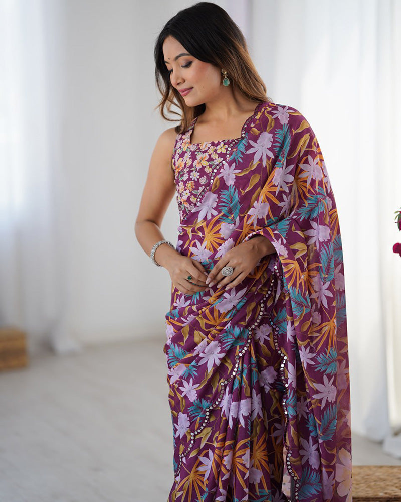 Exude royal elegance with this wine color Chinnon silk saree, beautifully adorned with intricate mirror work for a refined look. Paired with an unstitched blouse, it’s perfect for weddings, festive occasions, and grand celebrations.