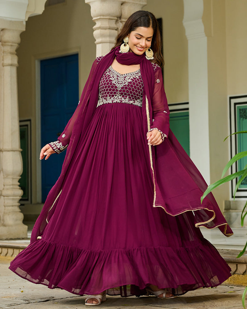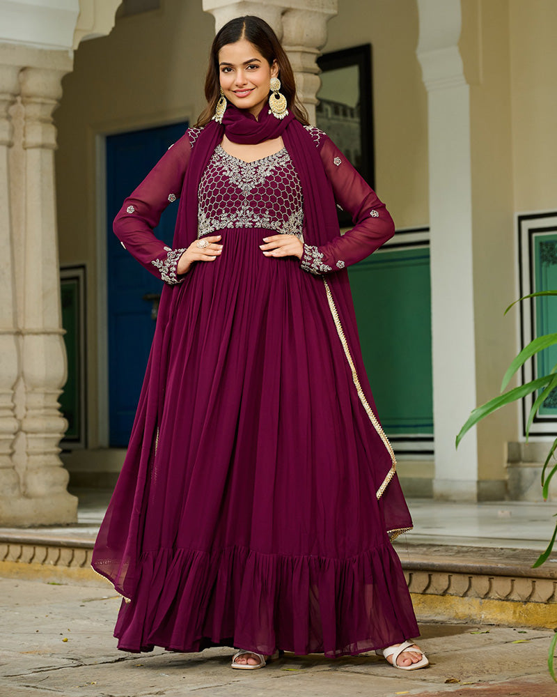 Exude sophistication in this wine color faux blooming gown, beautifully adorned with delicate bead embroidery. Perfect for evening parties, receptions, and festive occasions, it offers a stunning blend of elegance and modern style.