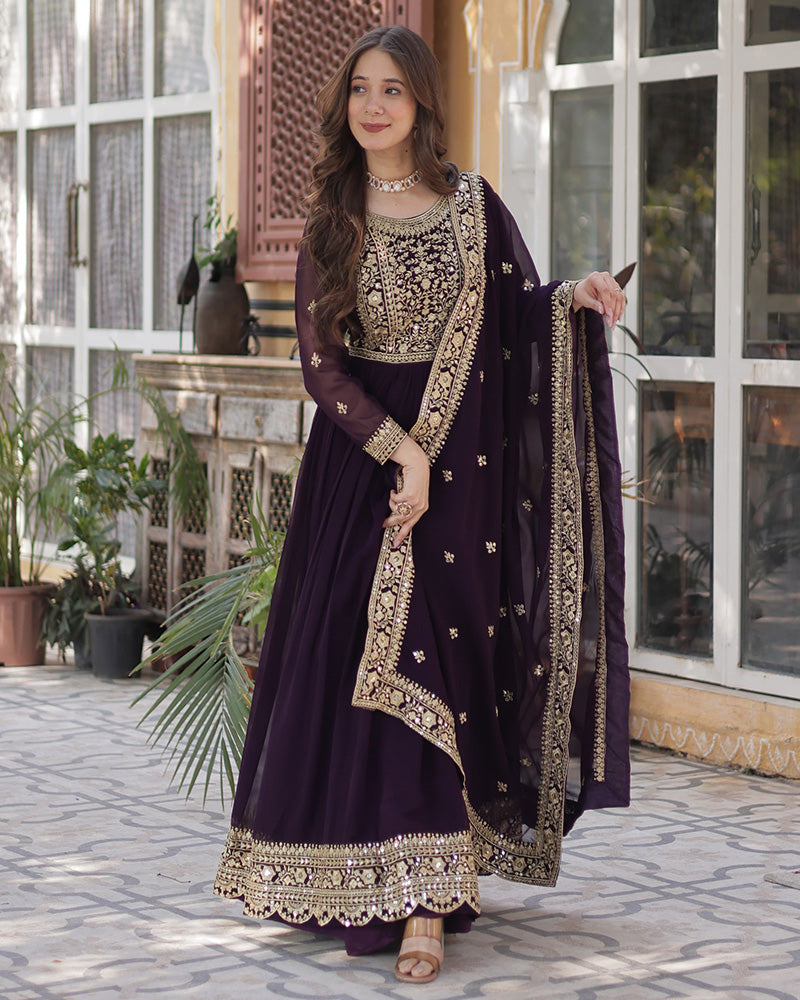 Elegant and eye-catching, this Wine Color Faux Blooming Embroidered Gown features intricate floral embroidery on soft, flowy fabric. Perfect for weddings, parties, or special occasions, it offers a rich look with a comfortable fit, blending classic charm with modern grace.