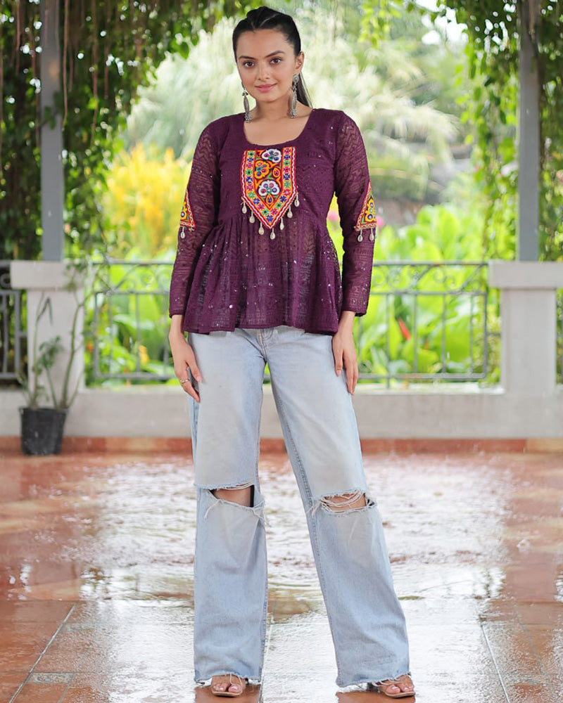 Wine Color Georgette Schiffli Work Navratri Kediya