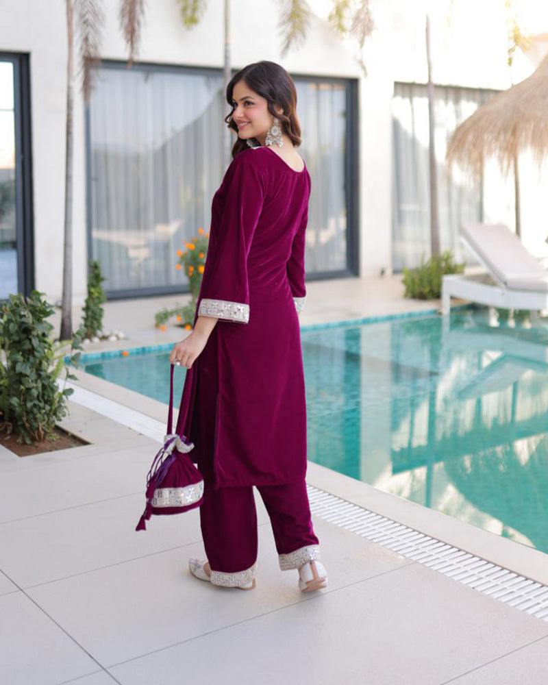Wine Color Ice Velvet Embroidered Plazzo Suit
