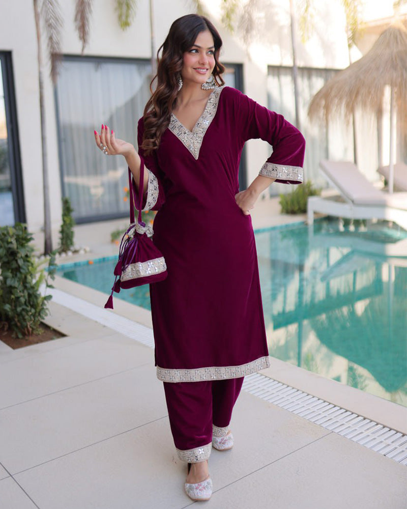 Sophisticated and graceful, this wine color ice velvet palazzo suit is beautifully enhanced with elegant embroidery for a rich, luxurious look. Ideal for festive occasions and celebrations, it offers both comfort and timeless style.