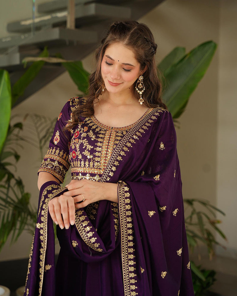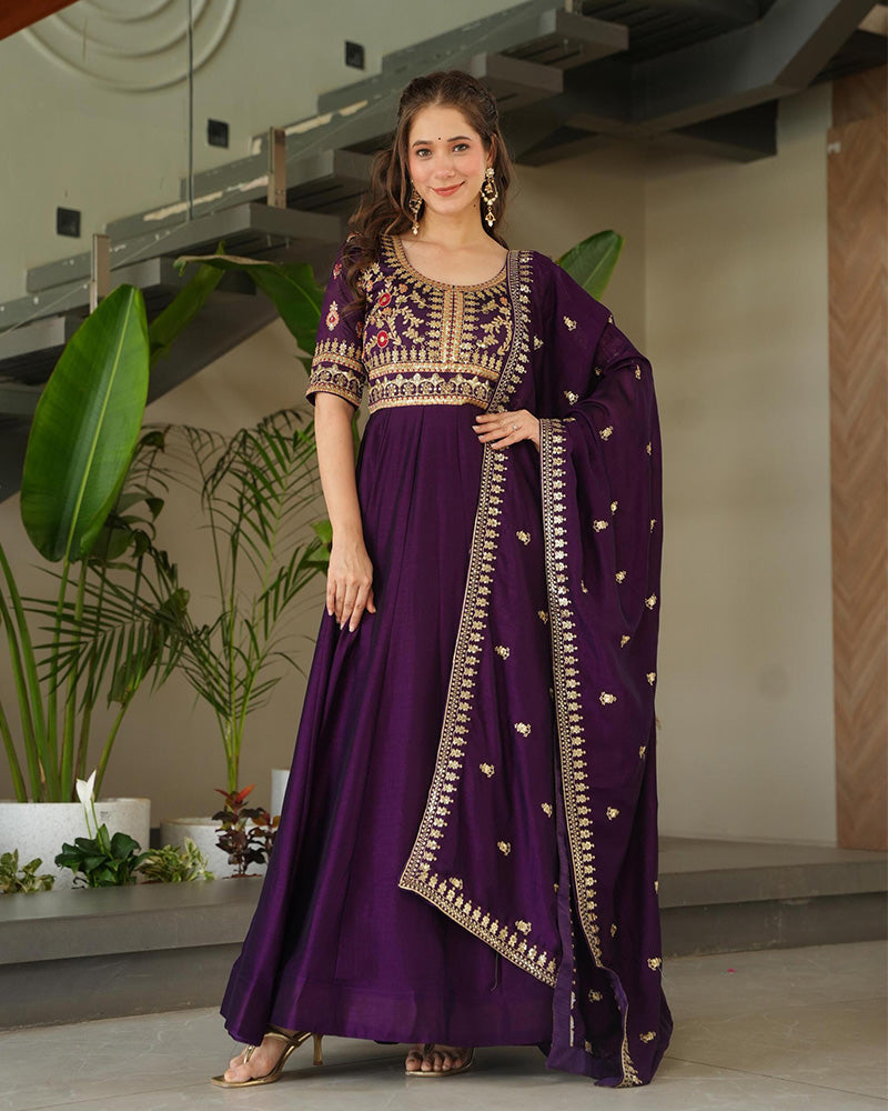 Rich and regal, this Wine Color Vichitra Silk Gown showcases intricate embroidery on luxurious fabric, making it a perfect choice for weddings, receptions, and festive occasions. Elegant, comfortable, and timelessly stylish.