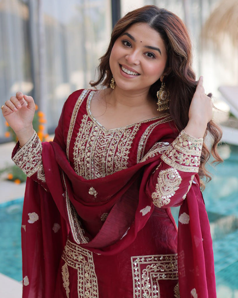Exude rich elegance with this Wine Maroon Fendi Silk Embroidered Kurti Suit, featuring intricate embroidery and a luxurious silk finish. Perfect for festive occasions, celebrations, and special gatherings.