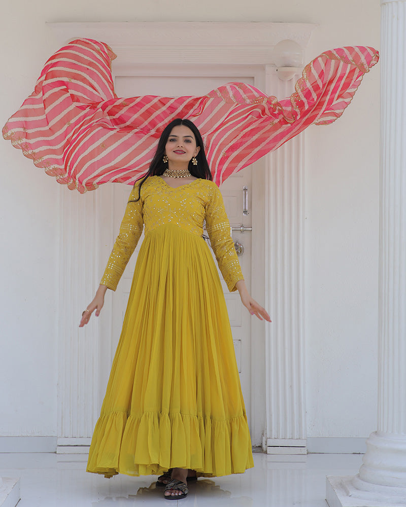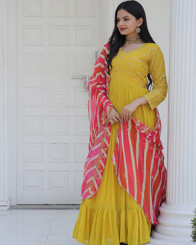 Yellow Color Designer Embroidered Gown With Leheriya Dupatta