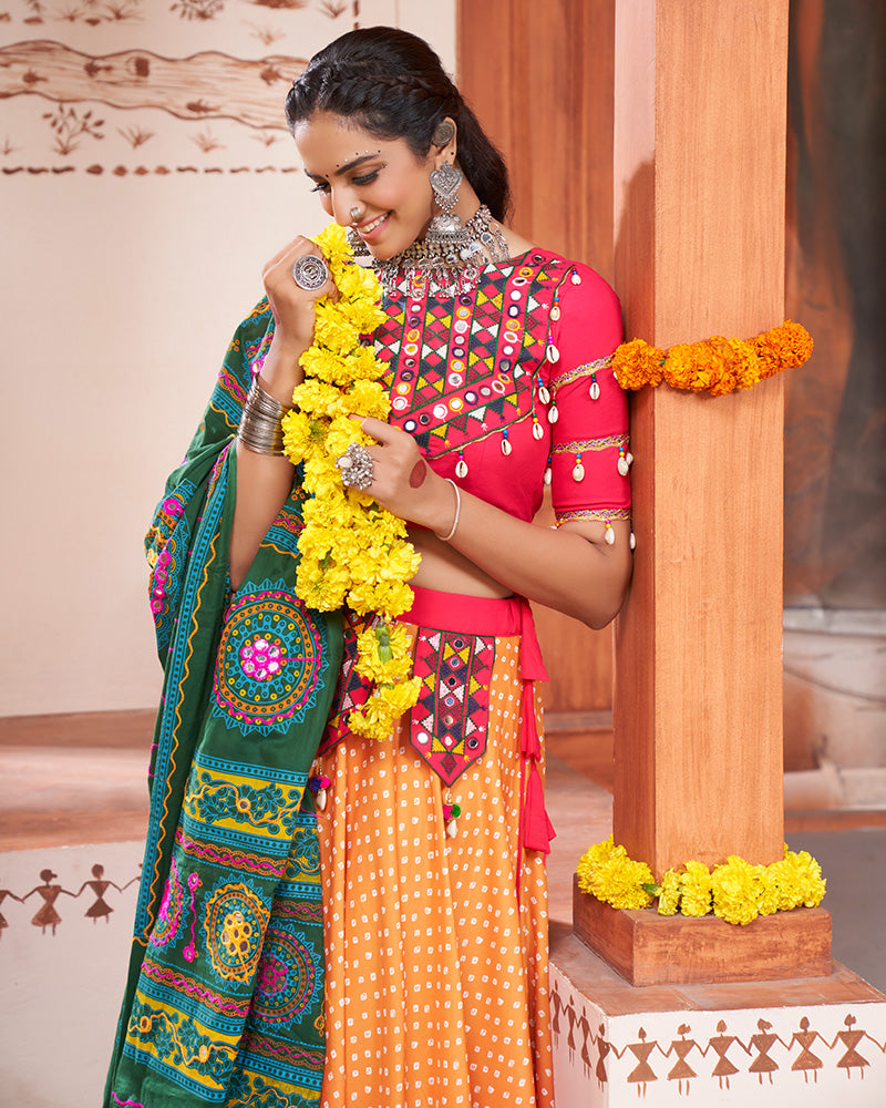 Introducing the Yellow Pink Color Viscose Rayon Print And Mirror Work Fully Stitched Navratri Lehenga Choli, a vibrant and stylish ensemble perfect for festive occasions. This fully stitched Lehenga Choli features a beautiful blend of yellow and pink hues, creating a striking and eye-catching look. Crafted from high-quality viscose rayon fabric, it offers both comfort and elegance. Adorned with intricate mirror work and captivating prints, this attire exudes charm and sophistication, making it an ideal choice for Navratri celebrations. With its flattering silhouette and exquisite detailing, it's sure to make you the center of attention at any event.